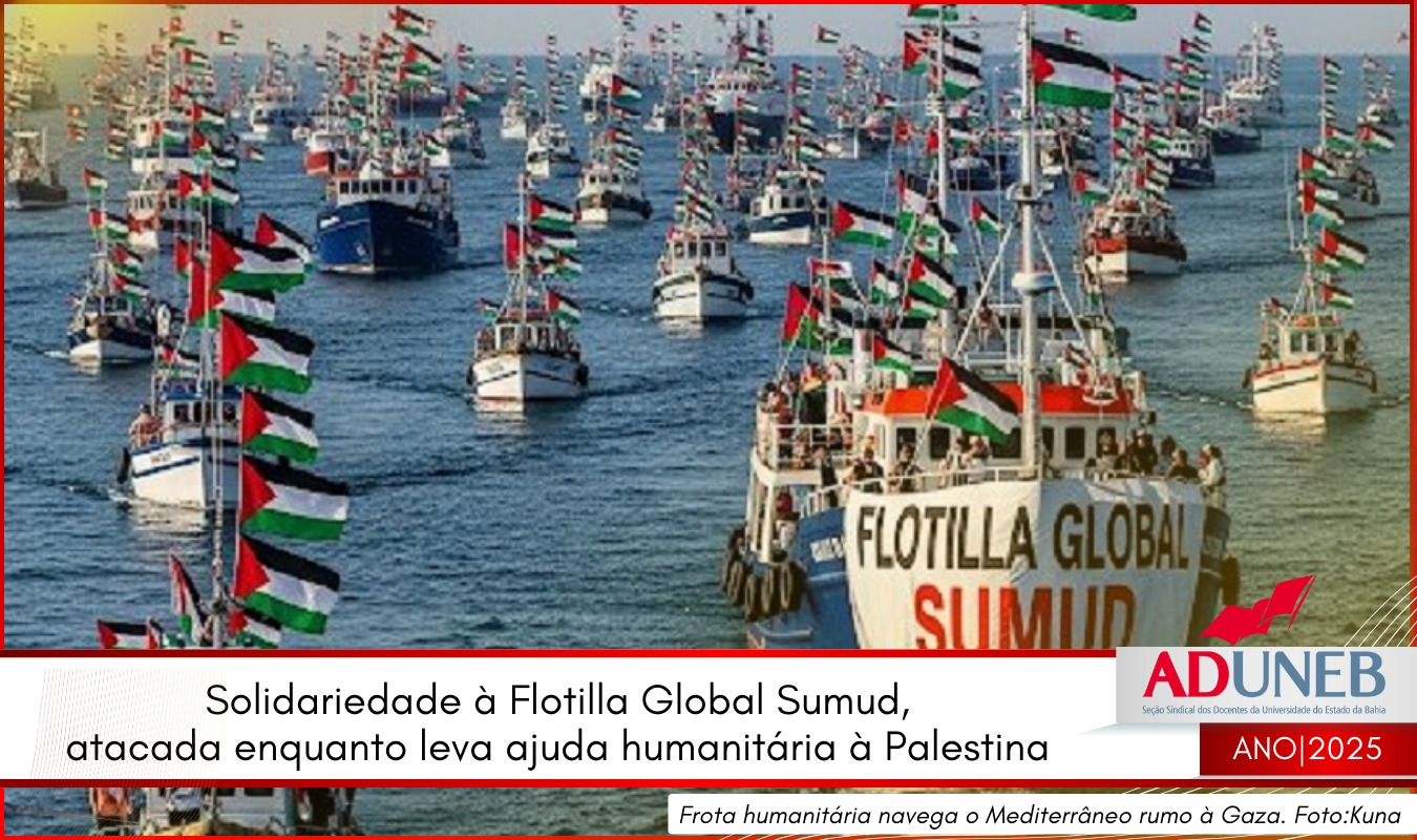 A ADUNEB vem a público manifestar solidariedade à Flotilla Global Sumud, que foi vítima de um ataque em águas internacionais, na madrugada desta quarta-feira (24). O ataque, perpetrado pelo exército israelense, ocorreu próximo à costa da Grécia, a cerca de mil quilômetros da Faixa de Gaza.