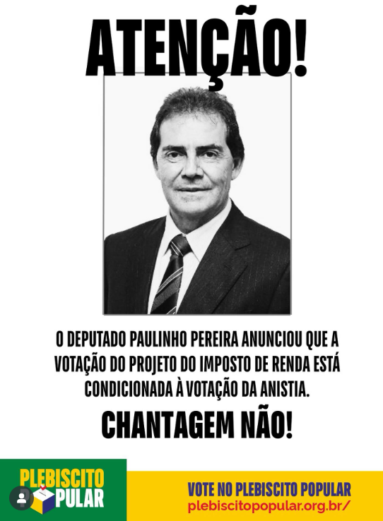 A Câmara quer condicionar a aprovação da Isenção do Imposto de Renda à aprovação do Projeto da Anistia. Além disso, tentam retirar a taxação dos super-ricos do projeto do IR. Precisamos pressionar para que o projeto do IR seja aprovado sem retrocessos. As ruas já deram o recado: não queremos anistia para golpistas!