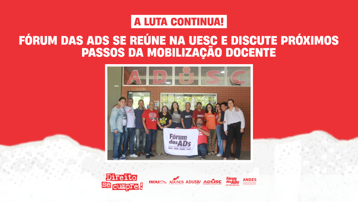O Fórum das ADs se reuniu, nessa segunda-feira (22), na Universidade Estadual de Santa Cruz (UESC), para avaliar a continuidade da mobilização da categoria nas próximas semanas. Estiveram presentes representantes das quatro ADs das Universidades Estaduais da Bahia (ADUSC, ADUFS, ADUNEB e ADUSB), além da Regional Nordeste III do ANDES-SN.