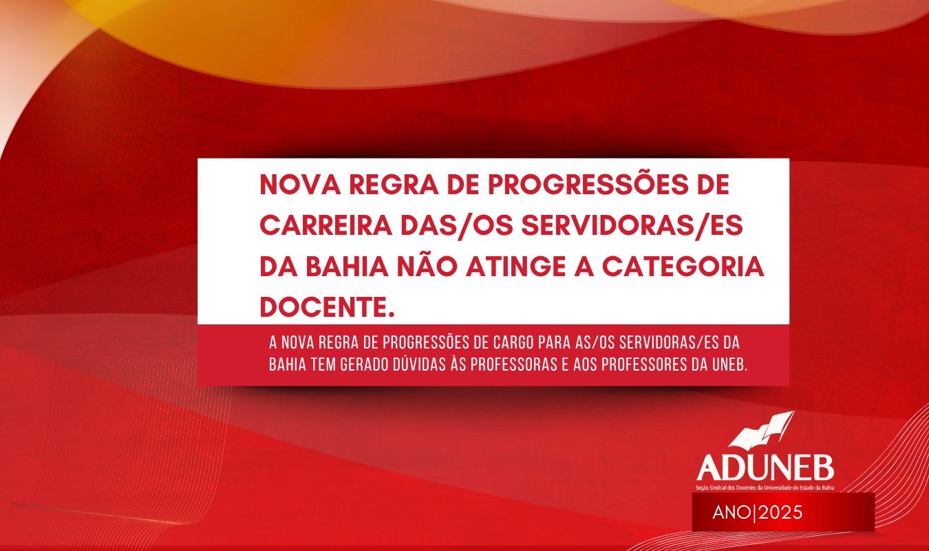Publicada no Diário Oficial do Estado no último sábado (04), a nova regra de progressões de cargo para as/os servidoras/es da Bahia tem gerado dúvidas às professoras e aos professores da UNEB. A ADUNEB, com base nas orientações de sua assessoria jurídica, informa que o decreto que determina a concessão de progressões de carreira somente a partir de tempo mínimo dentro dos órgãos baianos e em um interstício de três anos não se aplica à categoria docente.