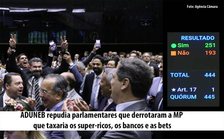 A Coordenação da ADUNEB vem a público repudiar com veemência os parlamentares da Câmara dos Deputados, em Brasília, que nesta quarta-feira (08), retiraram da pauta e impediram a votação da Medida Provisória (MP) 1303. O projeto era considerado fundamental pelo Governo Federal que, a partir da aprovação, teria um aumento de arrecadação para 2026. A MP impactaria menos de 1% dos mais ricos, corrigindo injustiças tributárias e cobrando mais imposto dos bilionários, a faixa populacional que mais lucra no país.