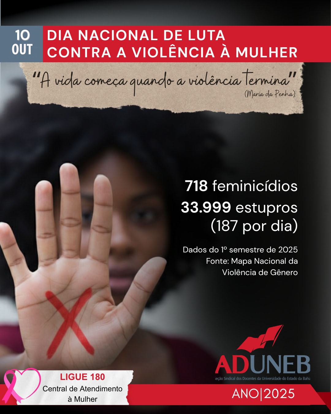 No canto inferior esquerdo, a informação: LIGUE 180 - Central de Atendimento à Mulher. No canto inferior direito, a logo da ADUNEB