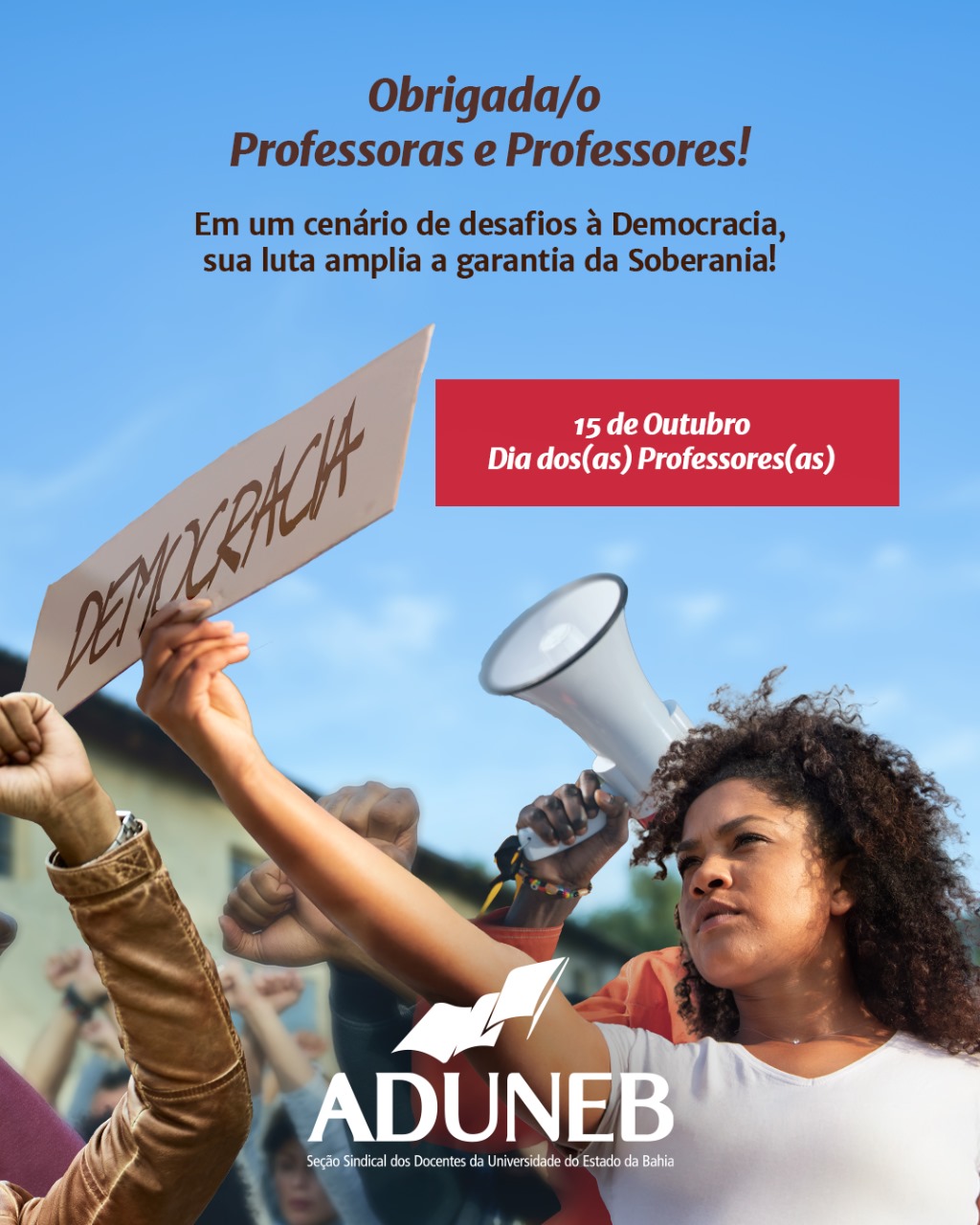 No topo, em branco sobre o céu azul, o texto: "Obrigada/o Professoras e Professores! Em um cenário de desafios à Democracia, sua luta amplia a garantia da Soberania!". À direita e no centro, uma tarja horizontal vermelha com o texto em branco: "15 de Outubro - Dia dos(as) Professores(as)". Na parte inferior, ao centro, a logo da ADUNEB.