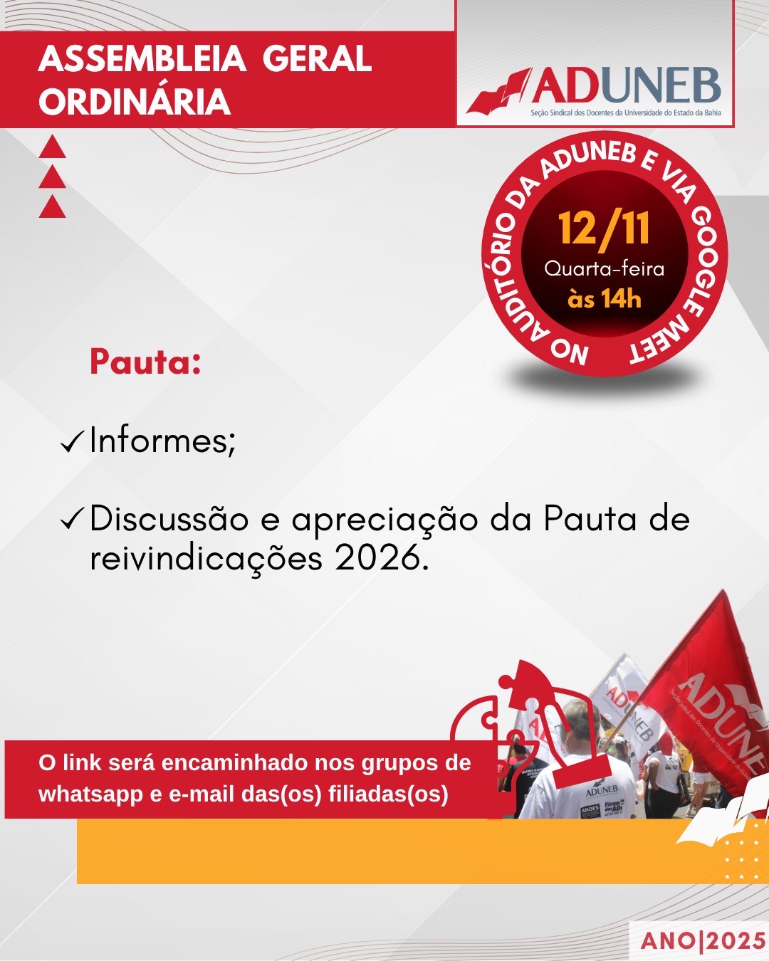 A Coordenação Executiva Colegiada da ADUNEB - SEÇÃO SINDICAL DOS DOCENTES DA UNIVERSIDADE DO ESTADO DA BAHIA, no uso de suas atribuições e de acordo com o que dispõe o seu Estatuto, convoca seus associados para uma ASSEMBLEIA GERAL ORDINÁRIA DOCENTE, a realizar-se no dia 12 de novembro de 2025 (quarta-feira), Auditório da ADUNEB – Salvador/BA, às 14h, em primeira convocação, e, às 14h30min, em segunda convocação, com qualquer número de sindicalizados presentes.