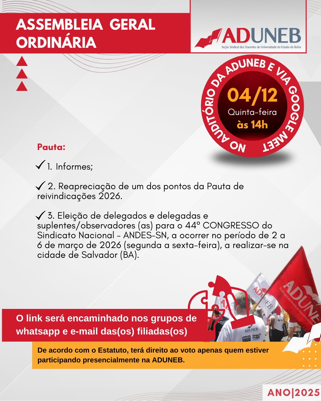 A Coordenação Executiva Colegiada da ADUNEB - SEÇÃO SINDICAL DOS DOCENTES DA UNIVERSIDADE DO ESTADO DA BAHIA, no uso de suas atribuições e de acordo com o que dispõe o seu Estatuto, convoca seus associados para uma ASSEMBLEIA GERAL ORDINÁRIA DOCENTE, a realizar-se no dia 4 de dezembro de 2025 (quinta-feira), Auditório da ADUNEB – Salvador/BA, às 14h, em primeira convocação, e, às 14h30min, em segunda convocação, com qualquer número de sindicalizados presentes.