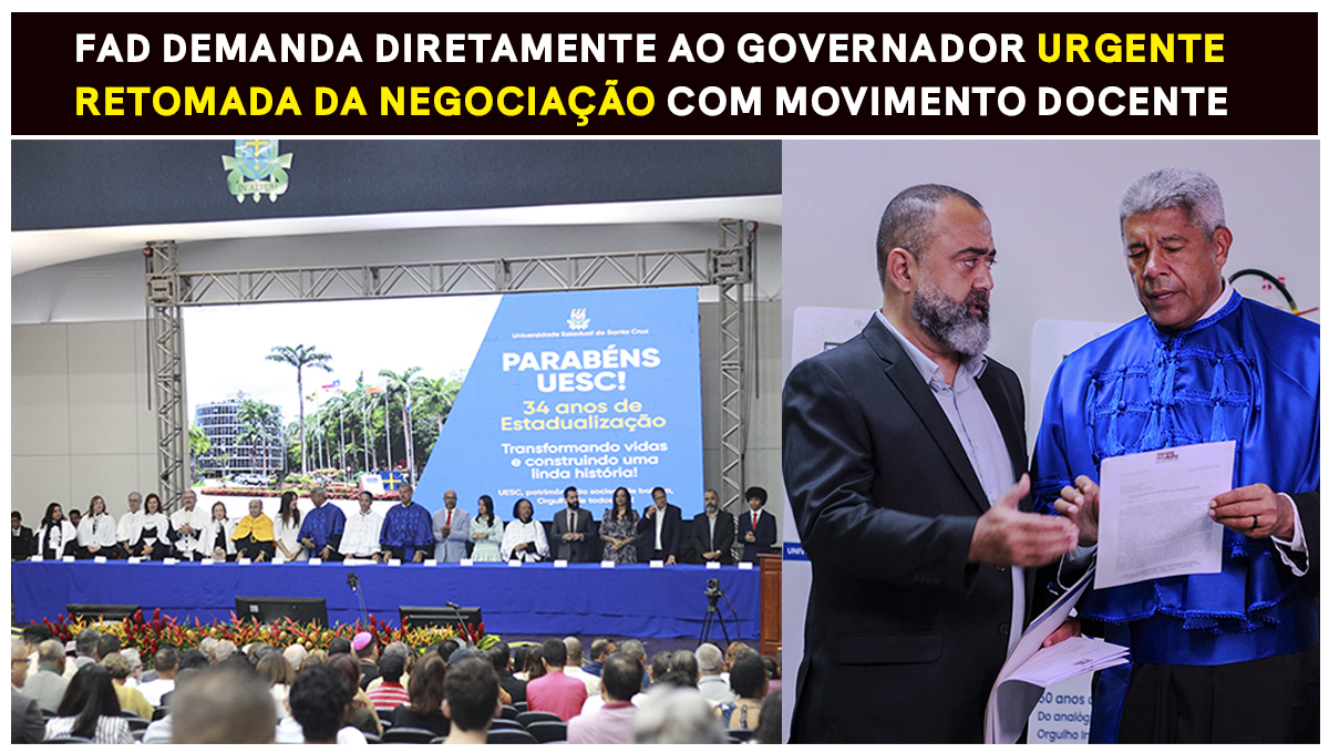 O Fórum das ADs cobrou do governador Jerônimo Rodrigues, durante a celebração dos 34 anos da UESC, a urgente retomada das negociações com o movimento docente, paradas desde 29 de julho. O ofício destaca que, após mais de quatro meses sem diálogo, seguem represadas pautas como o adicional de insalubridade devido a professores(as) que têm direito, e reforça a necessidade de estabelecer e cumprir um calendário de reuniões — compromisso assumido pelo governador em janeiro. Jerônimo afirmou que encaminhará a demanda à SERIN, enquanto a secretária de Educação, Rowenna Brito, sinalizou esforços para agendar um encontro ainda este ano.