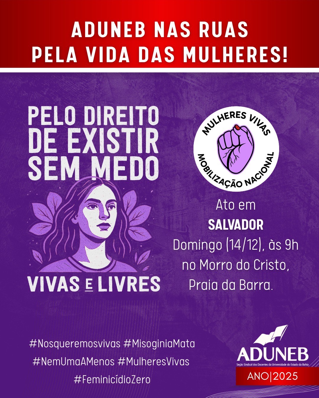 Ocupar as ruas em uma grande corrente pela vida das mulheres! A Coordenação da ADUNEB convoca a categoria docente para participar da manifestação "*Levante Mulheres Vivas*", que reivindicará a necessidade de dar um basta ao feminicídio, à xenofobia, à misoginia e ao machismo. Vamos todas juntas, juntos e juntes numa potente ação humana pela vida! O ato acontecerá em Salvador no domingo (14), com concentração a partir das 9h, no Morro do Cristo, na praia da Barra.