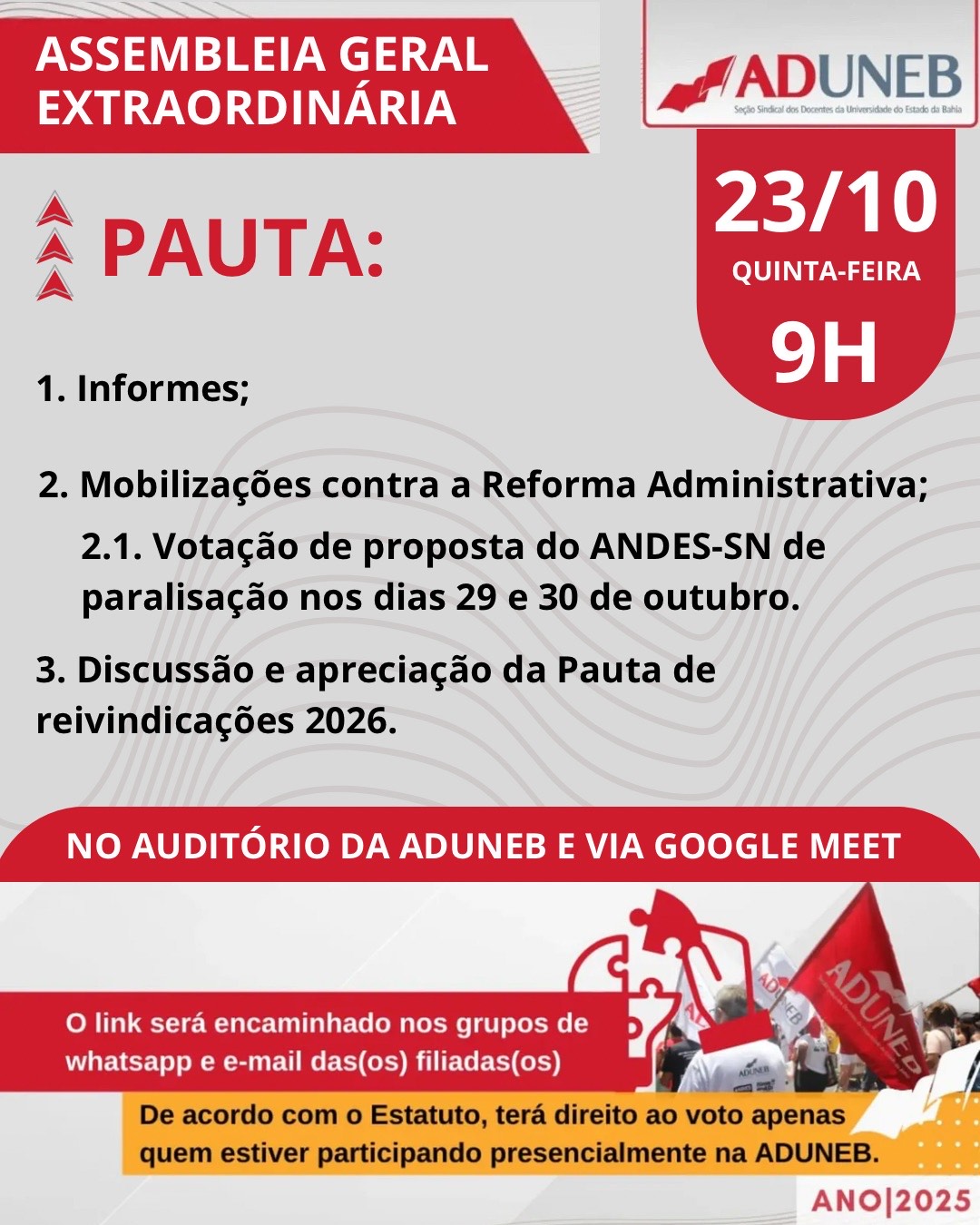 Paralisação contra a Reforma Administrativa: ADUNEB convida comunidade acadêmica para atividades de mobilização