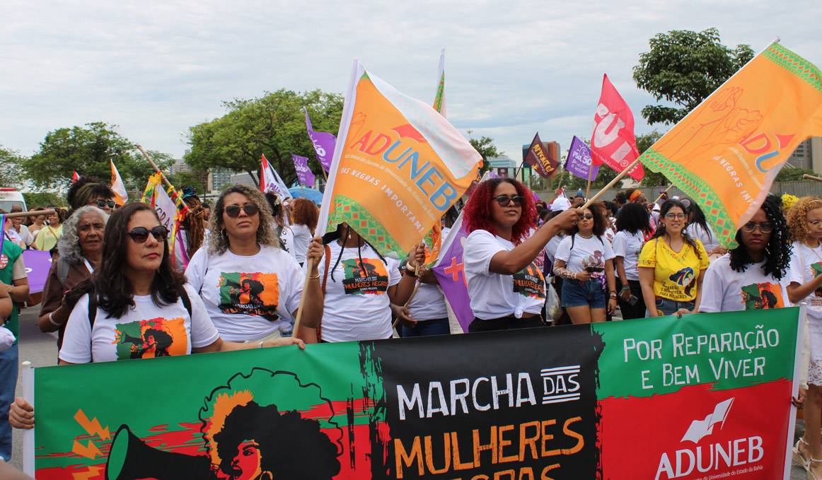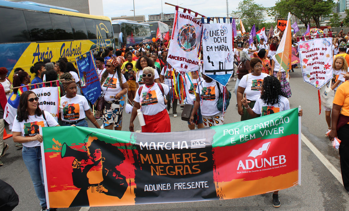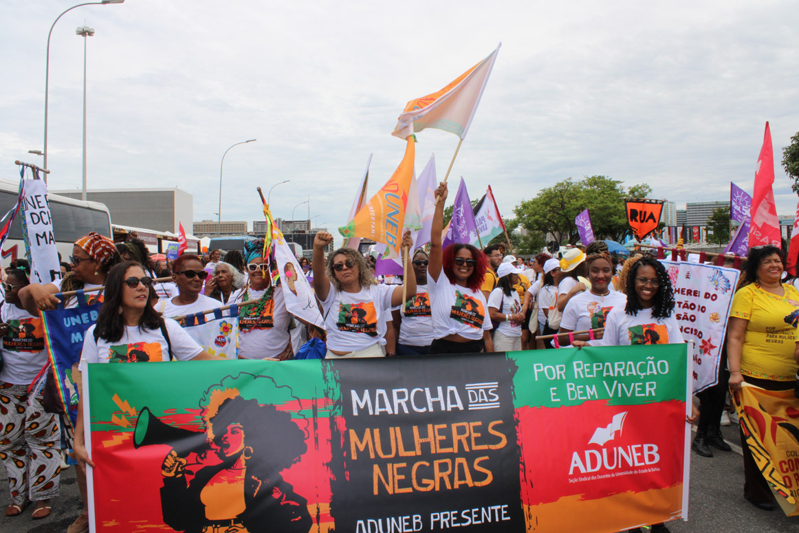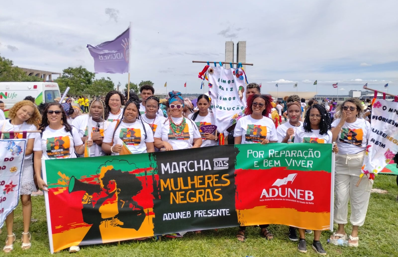Cumprindo seu papel na luta antirracista e feminista, a ADUNEB marcou presença levando um ônibus com professoras e estudantes. Também auxiliou no translado de integrantes de movimentos sociais. Apenas o percurso de ida – Salvador / Brasília – foram 1.468 km, percorridos em 26h de viagem, para somar forças contra o preconceito estrutural vigente, de um país que foi construído sob a dor, o sangue e o trabalho das mulheres negras, e ainda hoje, mais de 500 anos depois, ainda nega seu reconhecimento e sua reparação histórica.